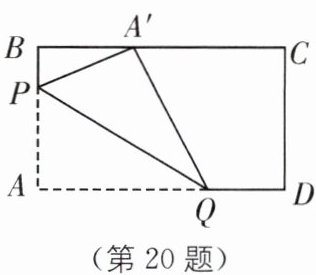 20. 中考新考法 操作探究 动手操作:在矩形纸片$ABCD$中,$AB = 3$,$AD = 5$。如图所示,折叠纸片使点$A落在边BC上的点A'$处,折痕为$PQ$。当点$A'在边BC$上移动时,折痕的端点$P$、$Q$也随之移动。若限定点$P$、$Q分别在边AB$、$AD$上移动,则点$A'在边BC$上可移动的最大距离为______。