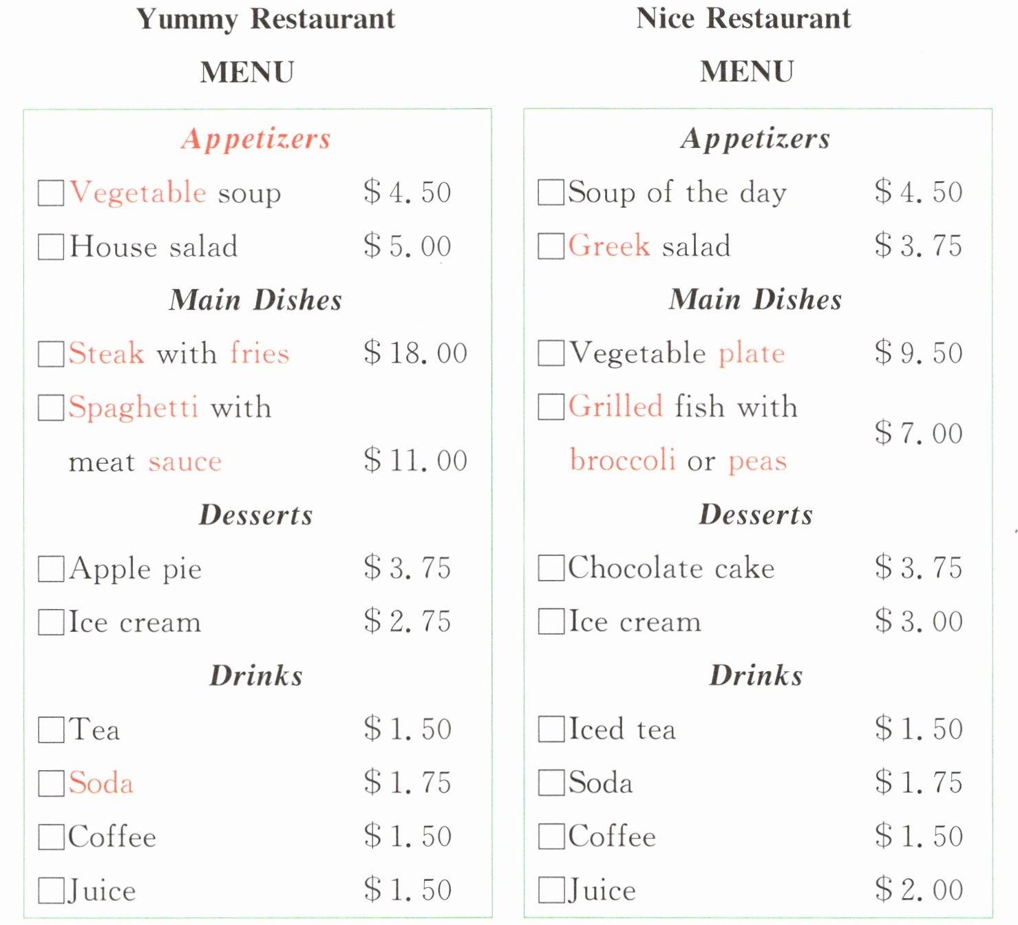 ()4. The juice in Yummy Restaurant is more expensive(昂贵的) than that in Nice Restaurant.