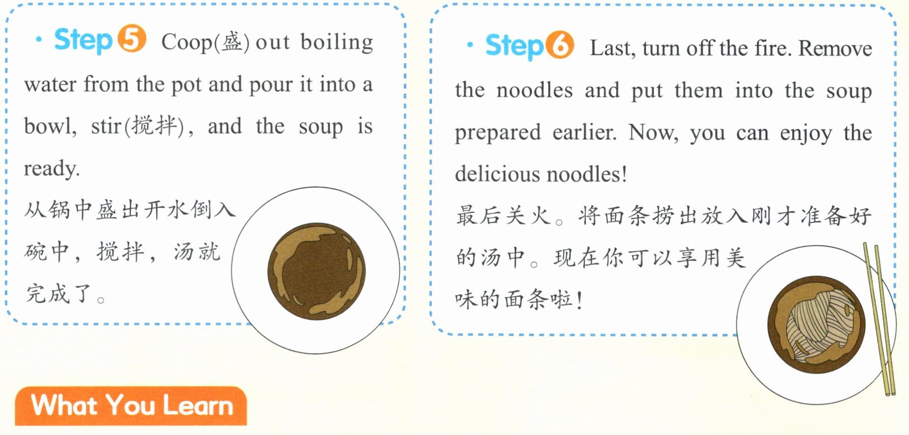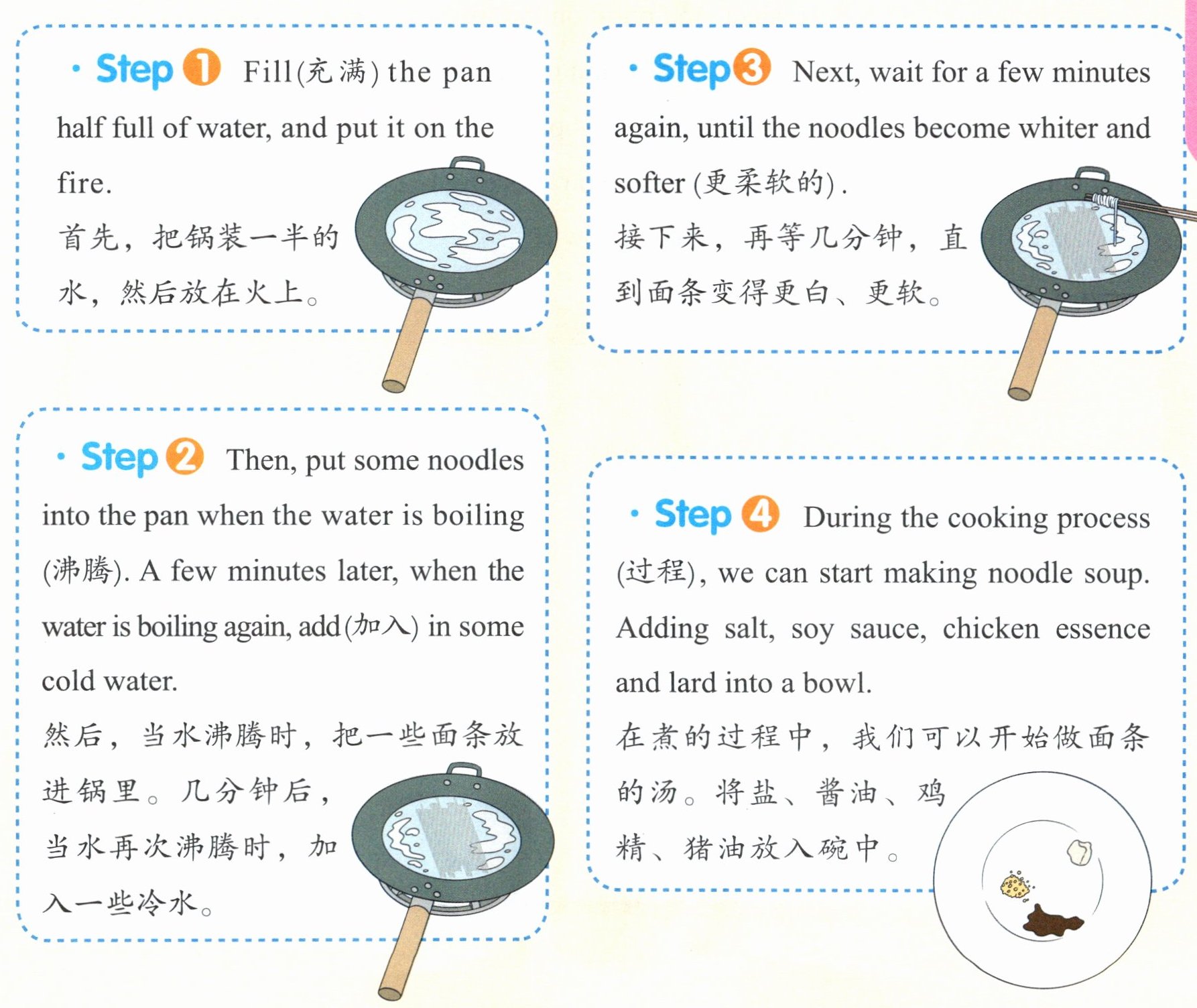 I always cook some noodles on the weekend by myself. I like this kind of food. It's healthy, fast and delicious. Now, let me tell you how to cook noodles! It takes several steps. 我总是在周末自己煮面条。我喜欢这种食物。它健康、快速、美味。现在,让我告诉你如何煮面条!这需要几个步骤。