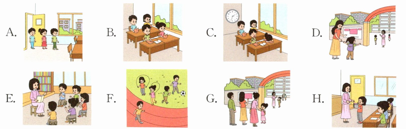 1~5 DHBFA6~8 ECG1. 解析 句意为“该上学了。所以我来了。你好,老师。再见,妈妈”,与图 D 相符。2. 解析 句意为“朋友们,你们好。又是工作和娱乐的一天。把作业交上来。它很好很棒”,与图 H 相符。3. 解析 句意为“书要读,算数要做。我非常喜欢做它们”,与图 B 相符。4. 解析 句意为“下课铃一响,我们就出去。在操场上跑步和玩耍”,与图 F 相符。5. 解析 句意为“然后我们回到教室。我们又开始学习了”,与图 A 相符。6. 解析 句意为“我们唱歌。我们拍手。我们跺脚”,与图 E 相符。7. 解析 句意为“更多的游戏,更多的工作,整个下午。我累了。快回家了吗”,与图 C 相符。8. 解析 句意为“现在是三点半。回家的时间到了。再见,老师。你好,妈妈”,与图 G 相符。