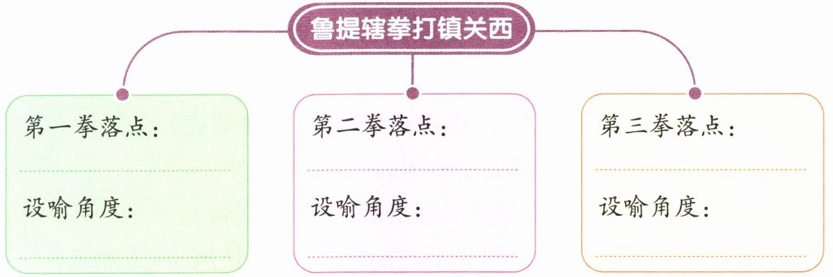(2)《鲁提辖拳打镇关西》这段故事写得极为精彩,三拳有三个落点,而写郑屠的感受又从三个角度设喻。请将三个落点和设喻的角度分别填在下面的思维导图里。