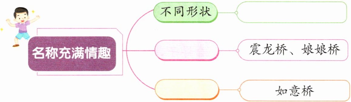2. 短文第3自然段围绕“家乡石桥的名称也美极了”写了哪些方面的内容?请简要概括,完成下面的思维导图。