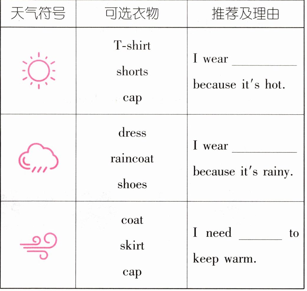 十五 在夏令营“小小气象员”体验活动中,营员们需要依据不同天气推荐合适的着装。请根据要求,完成下面的任务。