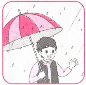“Pitter-patter!” Rain hits an umbrella. Tom laughs.