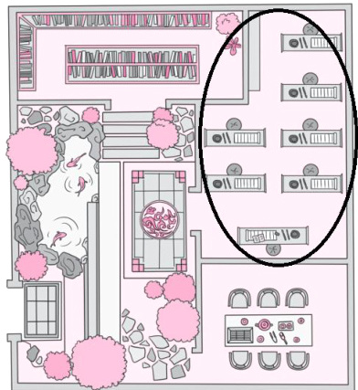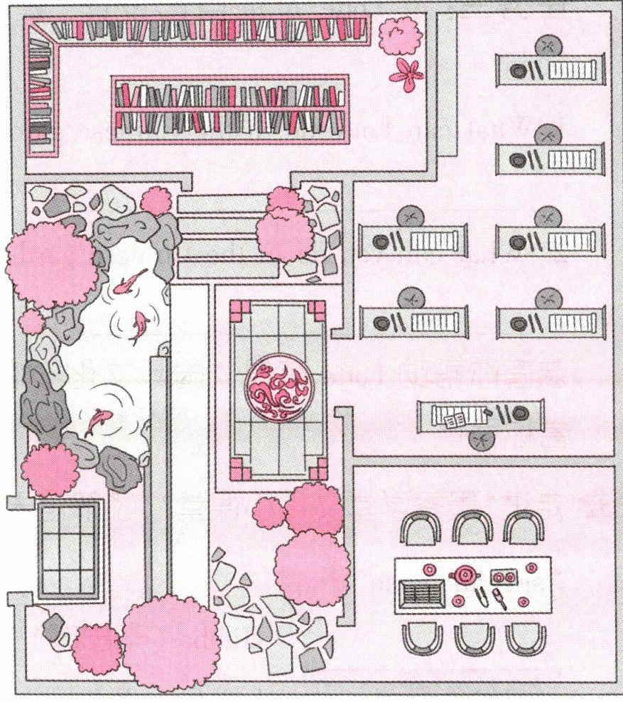 There's a calligraphy room(书法教室), a tea ceremony room(茶艺室), a classic library(国学书库), and even a Chinese garden(中式庭院)here!