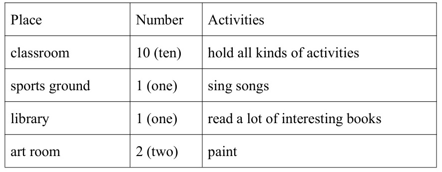 Hello! I'm Camper Chen. Welcome to Sunshine Summer Camp! Let's explore! There are ten classrooms for campers. They can hold all kinds of activities(活动). Look! There is a big sports ground. We sing songs here at night! Here is a big library. We can read a lot of interesting books! There are two art rooms. Some students paint in the art rooms. They like painting there.
