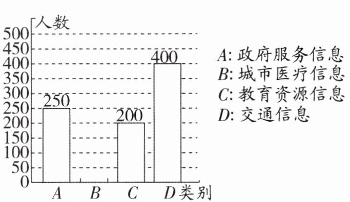 (4)由扇形统计图知,关注交通信息的人数最多;由条形统计图知,关注交通信息的人数是关注政府服务信息与关注城市医疗信息的人数和(合理即可)。