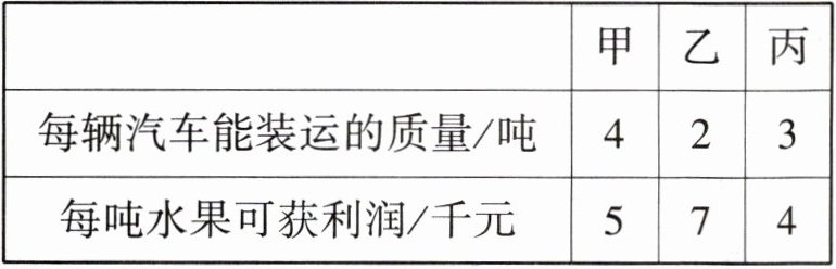 21. (12分)某水果基地计划装运甲、乙、丙三种水果到外地销售(每辆汽车规定满载,并且只装一种水果). 如表为装运甲、乙、丙三种水果的质量及利润.