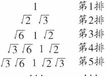 10. 将$1,\sqrt{2},\sqrt{3},\sqrt{6}$按如图所示的方式排列.若规定$(m,n)$表示第m排从左向右第n个数,则$(5,4)与(15,7)$表示的两数之和是 (