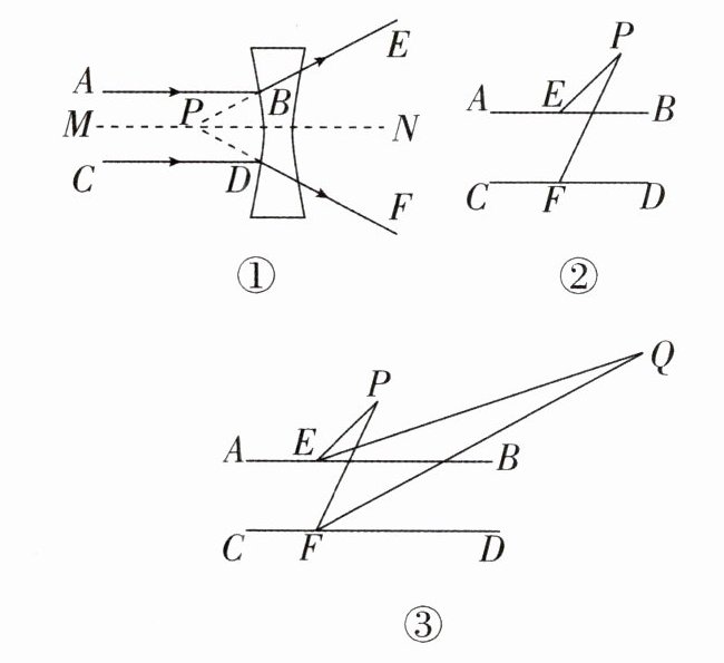 如图①,小明同学在做光的折射实验时发现:平行于主光轴$MN的光线AB和CD$经过凹透镜的折射后,折射光线$BE$、$DF的反向延长线交于主光轴MN上一点P$。