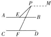 因为 $ A B // C D$,所以 $ P M // A B // C D$,所以 $ \angle M P F + \angle P F D = 180 ^ { \circ }$,$ \angle M P E + \angle P E B = 180 ^ { \circ }$,所以 $ \angle M P F + \angle P F D = \angle M P E + \angle P E B$。因为 $ \angle P E B = \alpha$,$ \angle P F D = \beta$,$ \angle M P E = \angle M P F + \angle E P F$,所以 $ \angle M P F + \beta = \angle M P F + \angle E P F + \alpha$,所以 $ \angle E P F = \beta - \alpha$,故答案为 $ \beta - \alpha$。