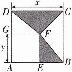 因为 $ AD = AB,AG = AE $,所以 $ AD - AG = AB - AE $,即 $ DG = BE = 2 $,所以 $ S_{阴影} = S_{△CDF} + S_{△BEF} = \frac{1}{2}CD·DG + \frac{1}{2}BE·EF = \frac{1}{2}×2x + \frac{1}{2}×2y = x + y $. 因为 $ x - y = 2 $,所以 $ (x - y)^{2} = 4 $. 因为 $ (x - y)^{2} = x^{2} - 2xy + y^{2},x^{2} + y^{2} = 34 $,所以 $ 34 - 2xy = 4 $,所以 $ 2xy = 30 $,所以 $ (x + y)^{2} = x^{2} + 2xy + y^{2} = 34 + 30 = 64 $,所以 $ x + y = 8 $,所以图中阴影部分面积和为 8.