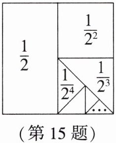 15. 在数学活动中,小明为了求 $ \frac{1}{2} + \frac{1}{2^2} + \frac{1}{2^3} + \frac{1}{2^4} + … + \frac{1}{2^n} $ 的值(结果用 $ n $ 表示),设计了如图所示的几何图形.请你利用这个几何图形求 $ \frac{1}{2} + \frac{1}{2^2} + \frac{1}{2^3} + \frac{1}{2^4} + … + \frac{1}{2^n} $ 的值,为