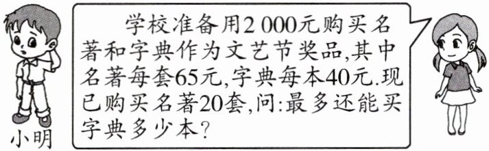设最多还能买字典 $ x $ 本,由题意,得 $ 65 × 20 + 40x \leq 2000 $,解得 $ x \leq \frac{35}{2} $,因为 $ x $ 为正整数,所以 $ x $ 的最大整数为 17,即最多还能买 17 本字典.