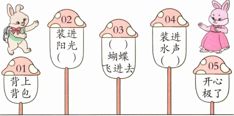 4. 小兔一路上收集了哪些风景?请根据提示把正确答案的序号填在括号里。
