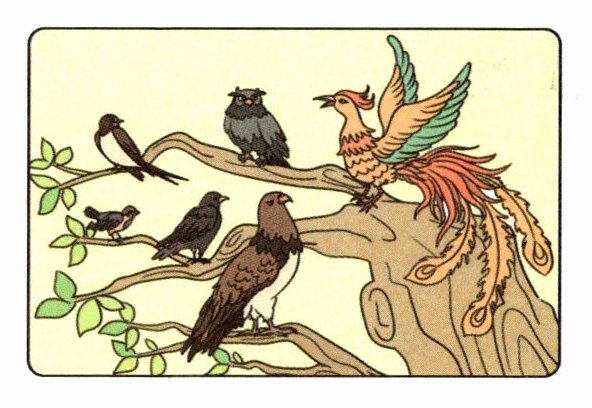 凤凰接下去说:“把叼来的树枝,一层一层地垒起来……”刚说到这里,乌鸦说:“原来就是垒树枝啊,我也学会了。”乌鸦得意地飞走了。
