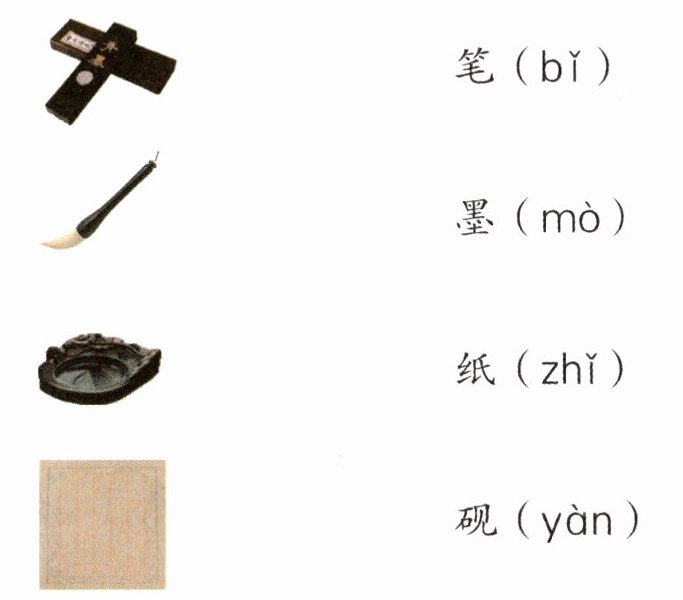 三 安安展示了一组文房四宝的图片,我来认一认,连一连,再给下面的句子加上标点。