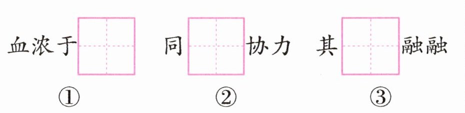 1. 在田字格中填写合适的汉字,再选择合适的词语填在括号里。(填序号)