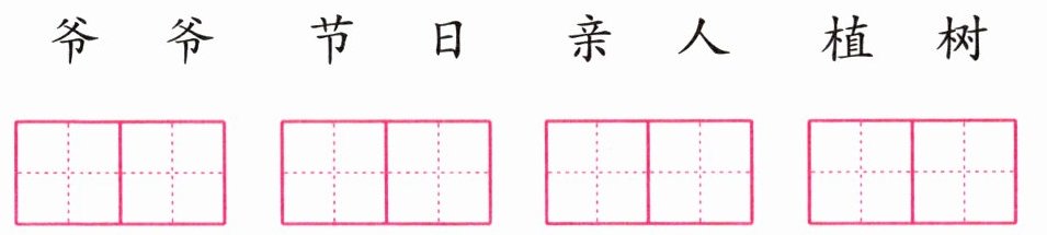 将“爷 爷 节 日 亲 人 植 树”规范、工整、美观地书写在田字格中