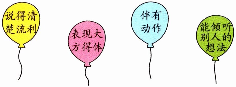 说得清楚流利 表现大方得体 伴有动作 能倾听别人的想法