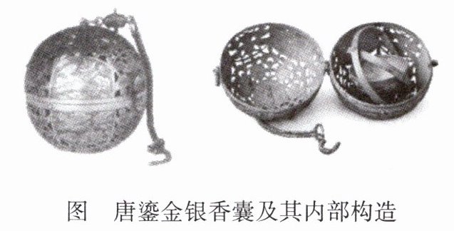 注:该香囊利用了陀螺仪万向支架原理,无论如何转动,中间焚香的盂始终保持水平状态,焚香都不会倾洒;外壳通体镂空,便于香气散出,且可随身挂佩,在唐朝风靡一时。