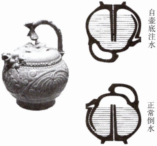 注:该壶利用了虹吸原理,注水孔在壶底,注水时,水并不会从壶嘴流出。水壶翻转后,水也不会从壶底漏出,只有当壶身向壶嘴处倾斜时,水才会自然流出,这增加了壶的密封性和便携性,后来该类壶普遍流行。