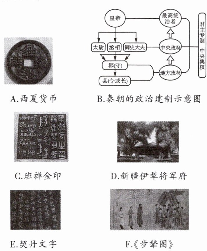 。(2)依据材料二,选出能体现辽宋夏金元时期民族交融的图片,并结合所学知识,归纳清朝对边疆地区管理的主要方式。