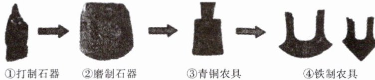 (1)材质变化:从石器到青铜再到铁;推动进入的社会形态:原始社会后期、奴隶社会、封建社会。