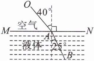 4. 当光线从空气中进入某种液体中时,由于两种介质不同,光线会发生偏离,这种现象叫作折射现象。如下图,一束光线$OA照射在液面MN$上,折射光线为$AB$。若入射角为$40^{\circ}$,折射角为$25^{\circ}$,则$∠OAB= $(