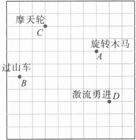 7. 小蒲周末打算去游乐场游玩,如下图.他根据游乐场的地图在网格中着重标注了自己游玩的四个地点,其中旋转木马、过山车、摩天轮的坐标分别为$A(3,2)$,$B(-3,0)$,$C(-1,4)$.