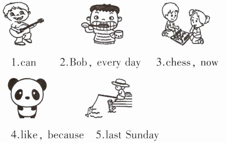 根据每小题所提供的图画情景和提示词,写出一个与图画情景相符的句子。