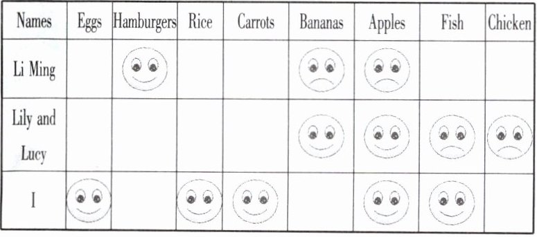Li Ming's favourite food is hamburgers. He doesn't like eating fruit. However, Lily and Lucy are different from him. In order to keep fit, they only eat fruit, such as bananas and apples. They hate eating fish and chicken. I like eggs, rice, carrots, apples and fish. I am the healthiest among them. In my opinion, we should eat less junk food because it is bad for us. We need to eat fruit and vegetables every day. They contain vitamins. They are good for our health.