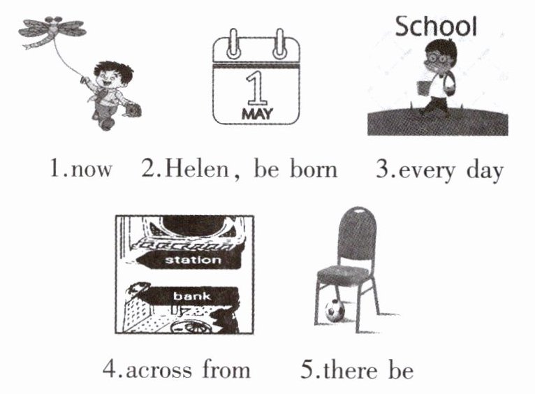 1.The boy is flying a kite now. 2.Helen was born on May 1st. 3.The boy walks to school/goes to school on foot every day. 4.The station is across from the bank./The bank is across from the station. 5.There is a football under the chair.