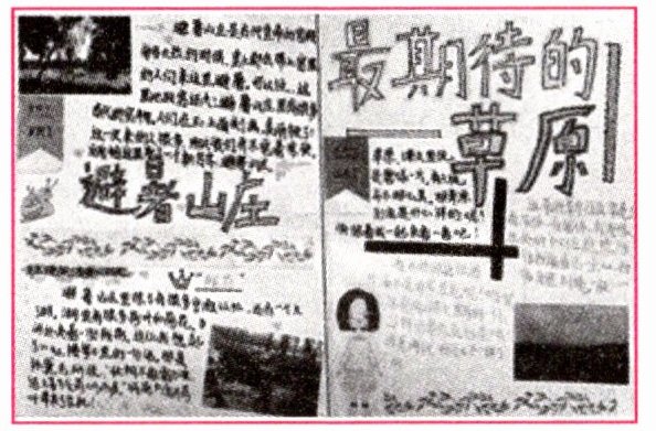 【解析】:本题要求制作“旅行手账”,需结合旅行前准备与途中记录,采用图文并茂的方式。从示例插图推测,可围绕具体地点(如避暑山庄、草原),记录资料查阅、行程规划、所见所闻及个人感受,通过文字描述、贴纸或简单图画呈现。