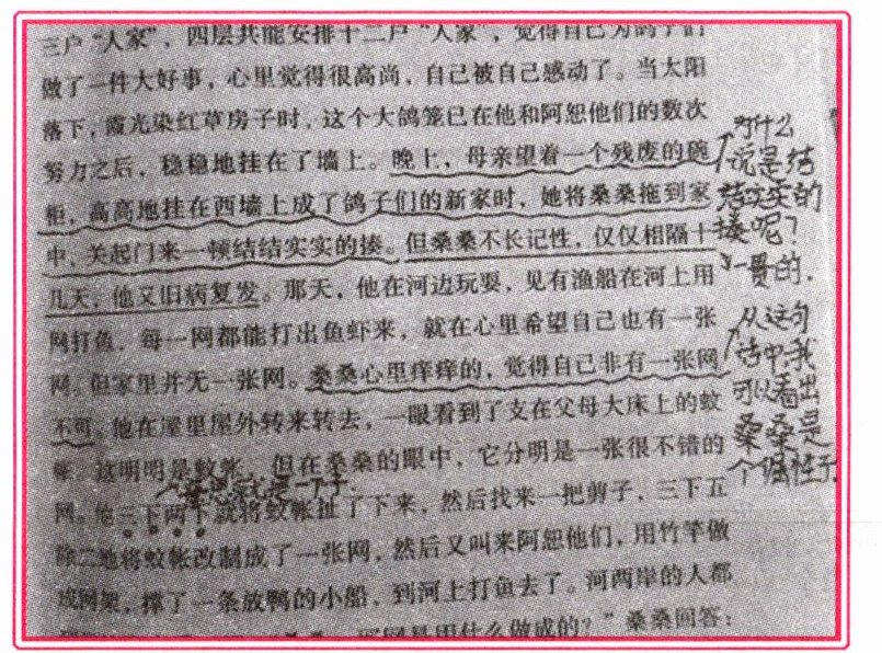 3. “桑桑想到了自己有个好住处,而他的鸽子却没有——他的许多鸽子还只能钻墙洞过夜或孵小鸽子,他心里就起了怜悯,决心要改善鸽子们的住处。”——体现桑桑对鸽子的关爱。