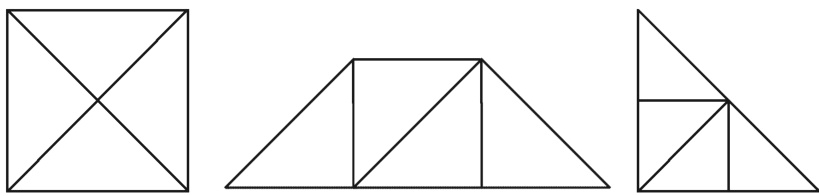 分别用4个完全一样的等腰直角三角形拼成一个长方形、一个正方形、一个梯形和一个三角形。请你照样子在相应的名称下面画出拼成的图形。