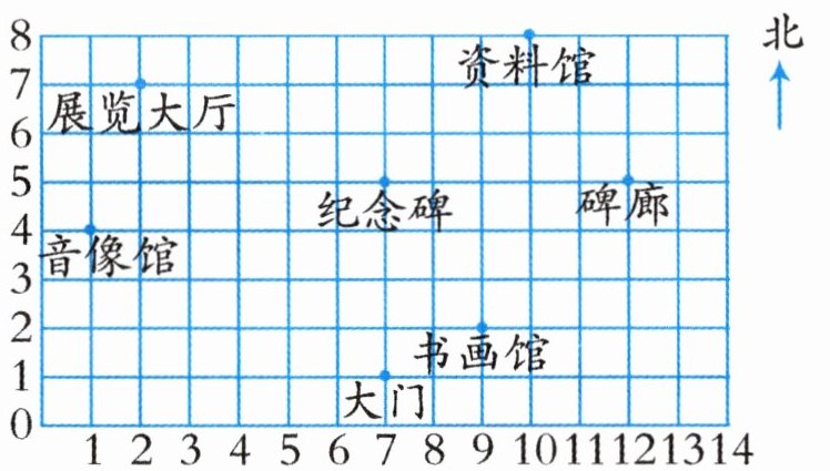 (1)在平面图上,大门的位置是( , ),书画馆的位置是( , ),音像馆的位置是( , ),展览大厅的位置是( , ),纪念碑的位置是( , ),资料馆的位置是( , ),碑廊的位置是( , )。