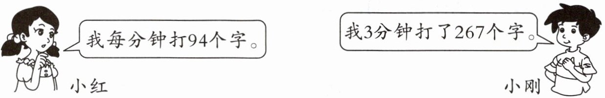 $ 267 ÷ 3 = 89 $(个) $ 89 < 94 $ 小红打字快。