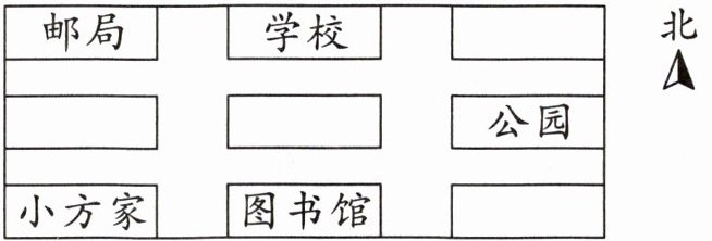1. 学校在图书馆的( )面,在小方家的( )方向;小方家在公园的( )方向,邮局在小方家的( )面。