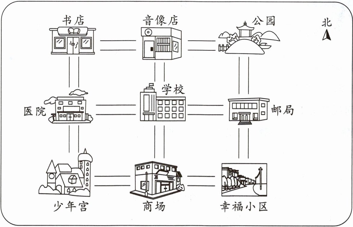 学校$\xrightarrow{西}$医院$\xrightarrow{北}$书店$\xrightarrow{东}$音像店$\xrightarrow{东}$公园$\xrightarrow{南}$邮局$\xrightarrow{南}$幸福小区$\xrightarrow{西}$商场(答案不唯一)