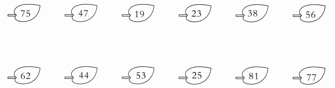 二、哪两片树叶上的数的和是$100$?连一连。