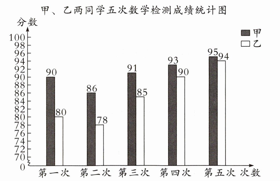 五、下面是甲、乙两同学五次数学检测成绩统计图,根据统计图回答下面问题。