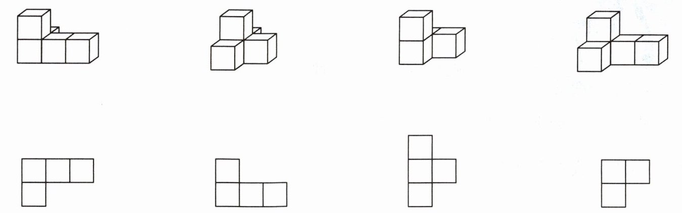 四、观察下面第一行的几何体,在第二行中找出相应的几何体从上面看到的形状,连一连。