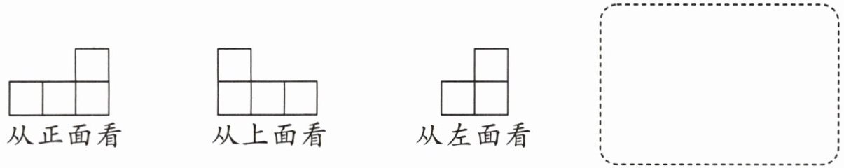 三、小明用几个相同的小正方体木块摆了一个立体图形,下面是从不同方向看到的图形。请在虚线框内画出这个立体图形。