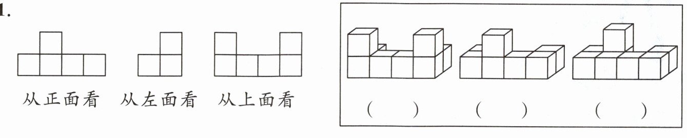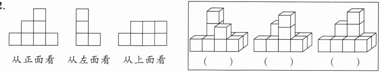 三、根据下面从不同方向看到的图形摆一摆,在摆放正确的几何体下面的括号里画“√”。