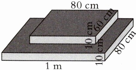 3. 下图是实验小学的升旗台,根据图中的数据,计算升旗台的体积是多少立方米?如果要给升旗台的表面贴上瓷砖(底面不贴),贴瓷砖的面积是多少平方米?
