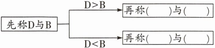 1. 有 3 个金属球,按质量从重到轻排列是:$A>B>C$,D 球与原来 3 个都不一样重。小明想用天平找出 D 球的质量排在第几,他通过画图将找的过程表示出来。