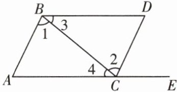 4.在判断两直线是否平行时,我们可以从“三线八角”的位置进行分析,如图,点E在AC的延长线上,给出下列条件:①$∠1= ∠2$;②$∠3= ∠4$;③$∠A= ∠DCE$;④$∠D= ∠DCE$;⑤$∠ABD+∠BDC= 180^{\circ }$;⑥$∠D+∠ACD= 180^{\circ }$.一定能判定$AB// CD$的条件是 ( )