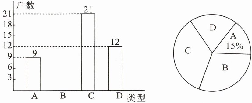 已知A类住户有$9$户,且A类住户在扇形统计图中所占的百分比为$15\%$,根据公式“总数$=$部分数量$÷$该部分所占百分比”,可得总户数为:$9÷15\% = 9÷0.15 = 60$(户)。