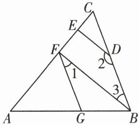 (1) 题目要求判断BF与DE是否平行。首先,由于$∠AGF=∠ABC$,根据同位角相等,两直线平行,可以得出$FG// BC$。接着,由于$∠1+∠2=180^{\circ}$,$∠1+∠3=180^{\circ}$,根据同角的补角相等,所以$∠2=∠3$,根据内错角相等,两直线平行,因此可以得出$BF// DE$。